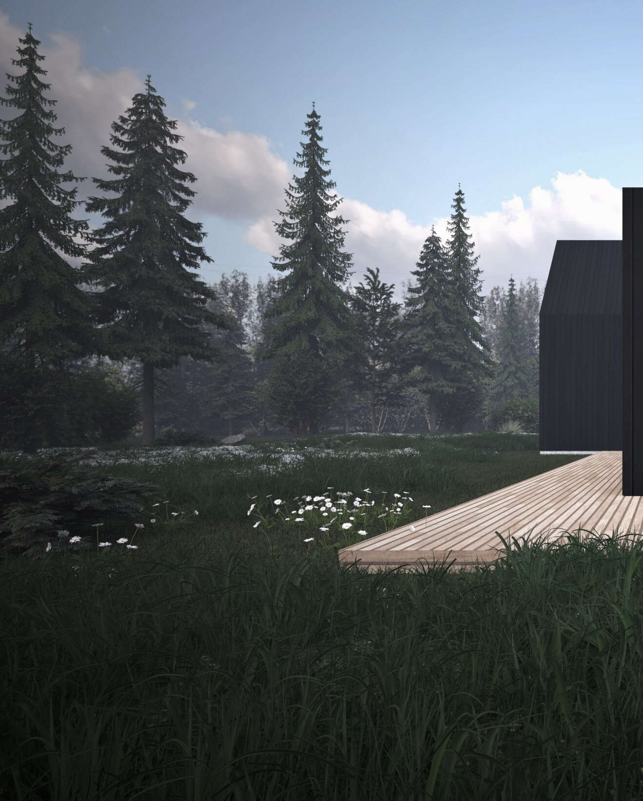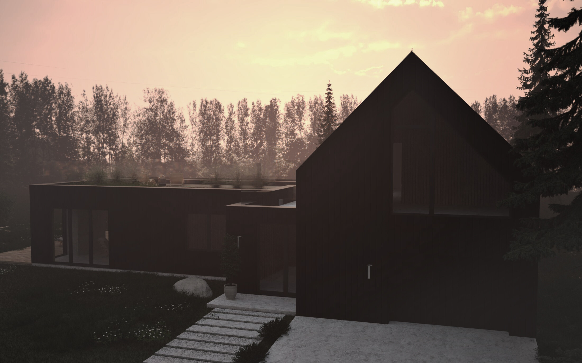 Na Mazurach, w miejscowości Przerwanki, w otoczeniu lasu, powstał nowy projekt domu typu nowoczesna stodoła. Prosta bryła budynku oraz czarna deska elewacyjna sprawiają, że dom idealnie komponuje się z naturalnym krajobrazem. Duże przeszklenia pozwalają na przenikanie zieleni do wnętrza budynku.