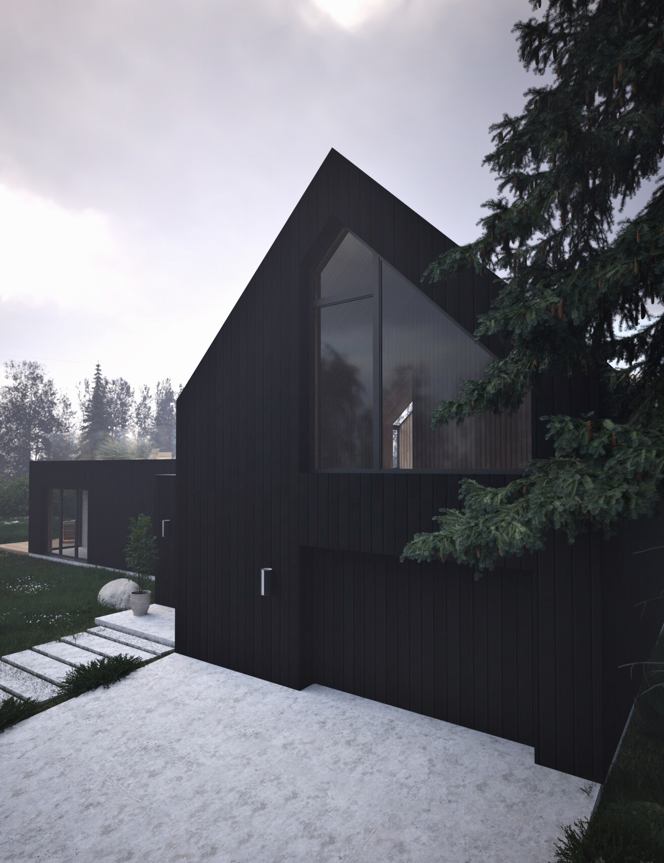 Dom składa się z dwóch brył. Parterowa część mieści strefę dzienną, natomiast druga bryła z poddaszem - część sypialnianą. Obie bryły połączone są przeszklonym łącznikiem.