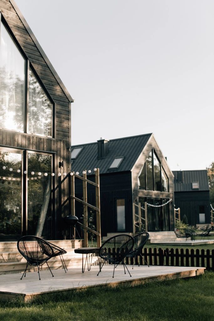 The cottages are designed in a modern style that combines functionality and aesthetics. The exteriors of the cottages are made of wooden planks in a black-brown color, which gives them an elegant and stylish look.