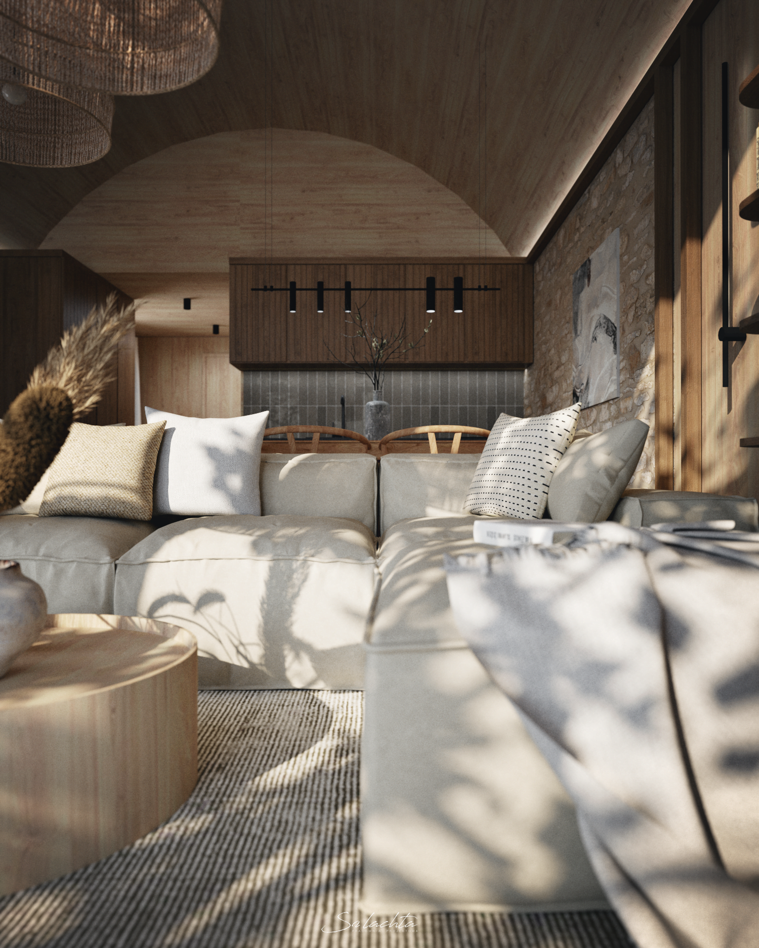 W części dziennej znajduje się przestronny salon z aneksem kuchennym, przedsionek oraz łazienka. Salon jest jasny i przytulny, dzięki dużym przeszkleniom wychodzącym na ogród. Aneks kuchenny jest funkcjonalny i wyposażony we wszystkie niezbędne sprzęty. Łazienka jest wygodna i komfortowa.