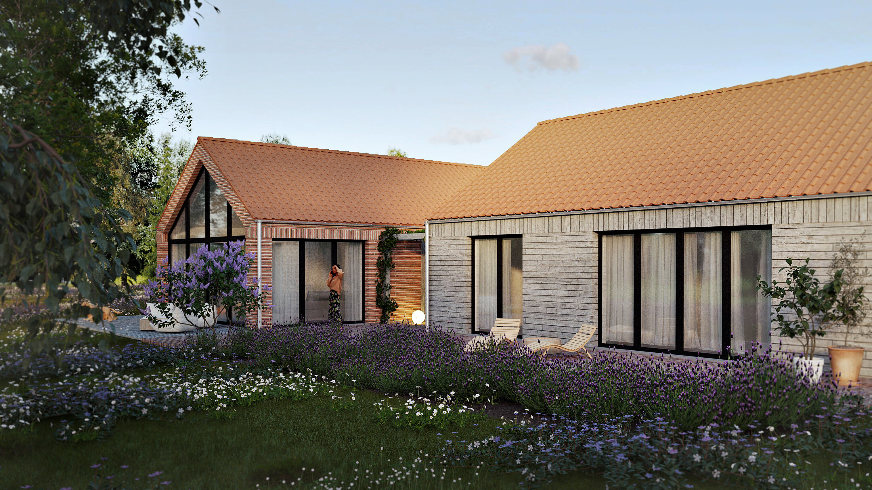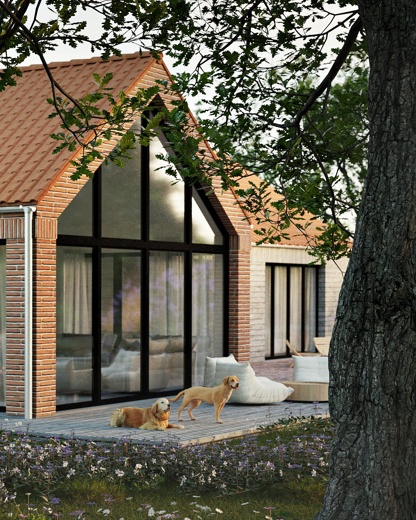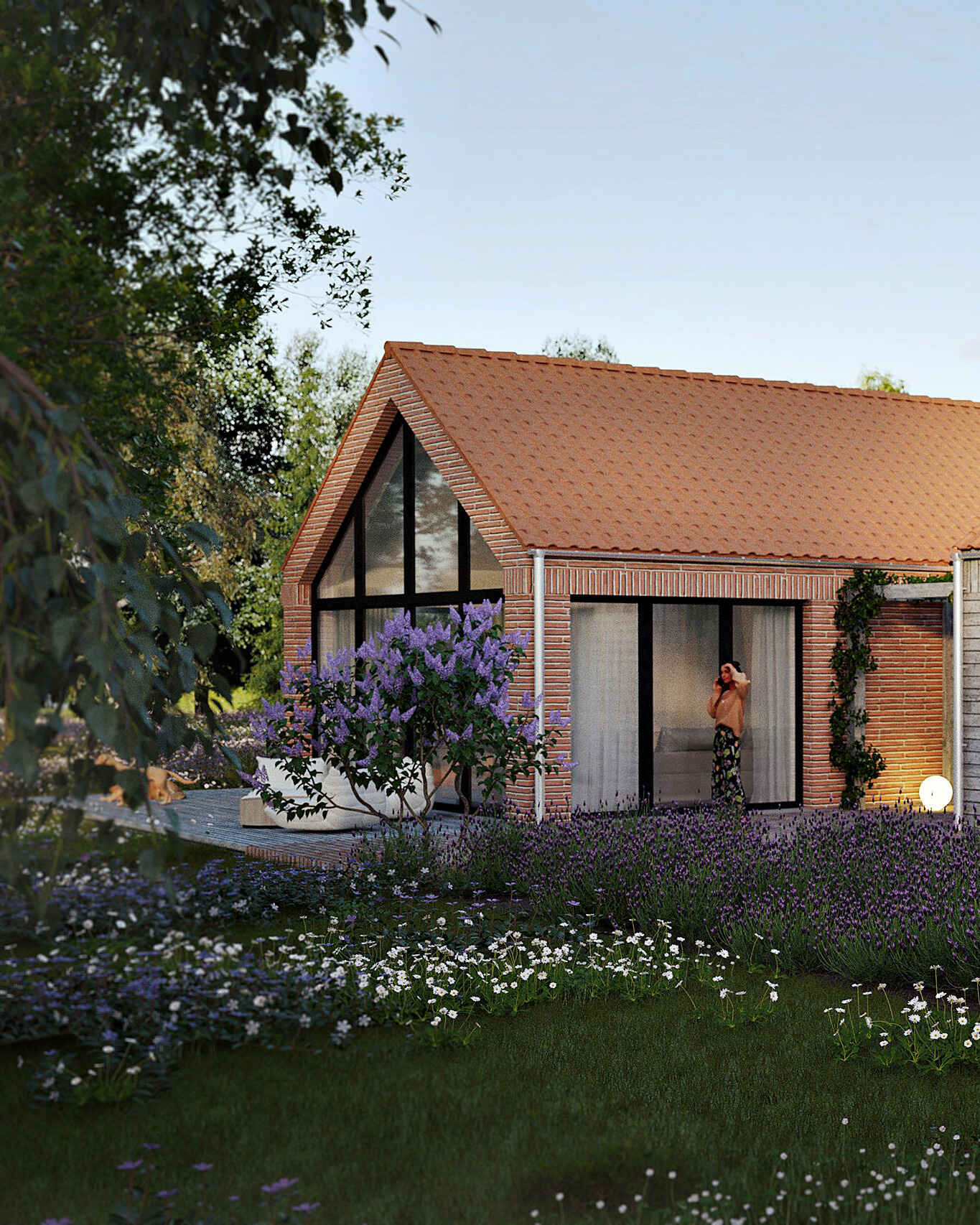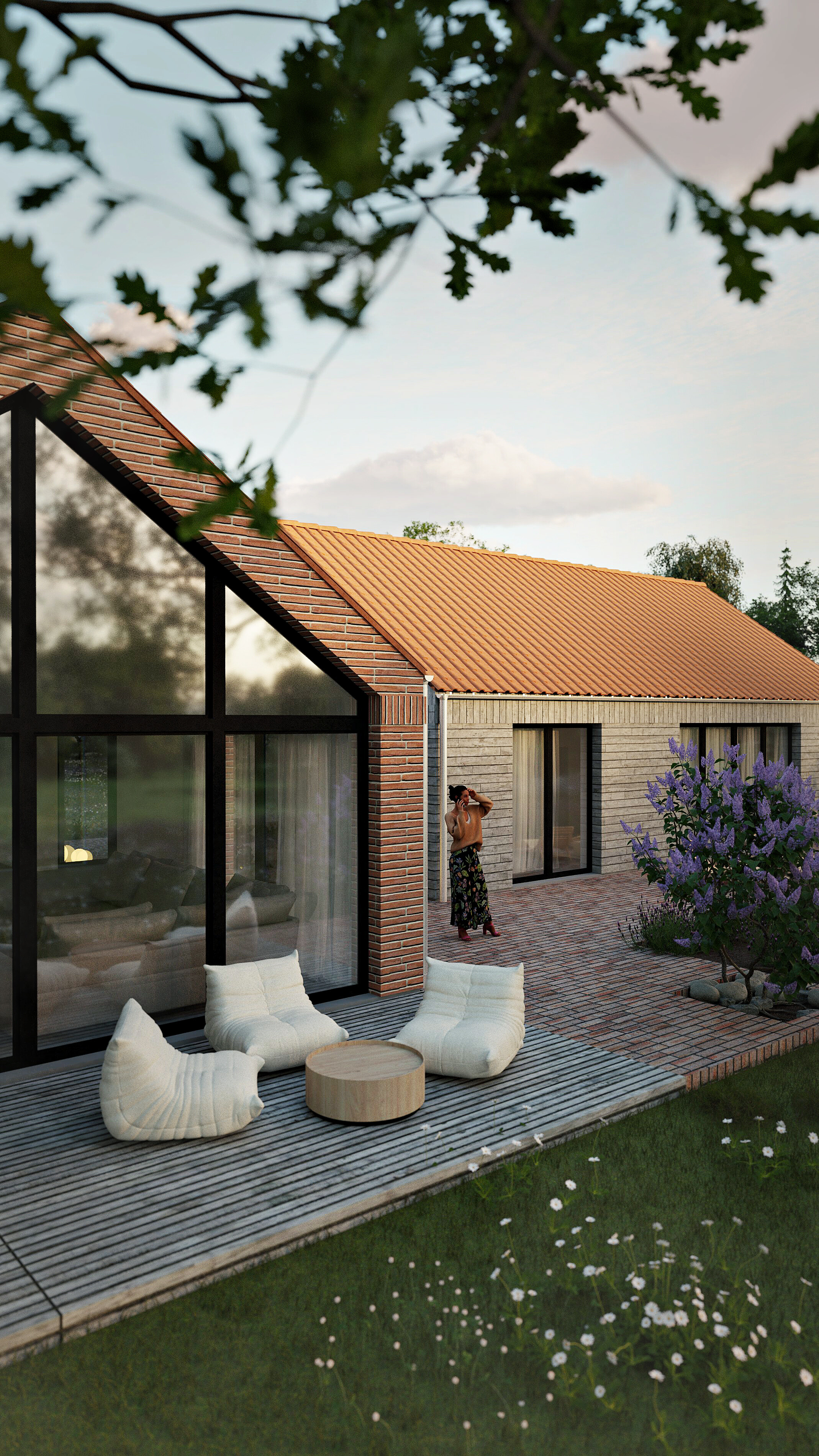Functionality and Comfort:The house consists of two structures connected by a glazed link, ensuring a functional division of space into living and private zones.