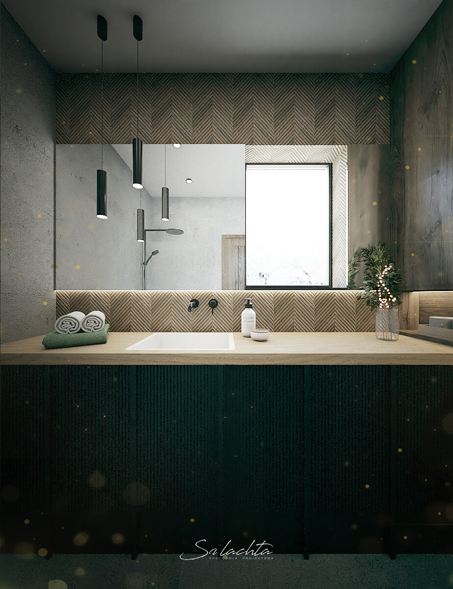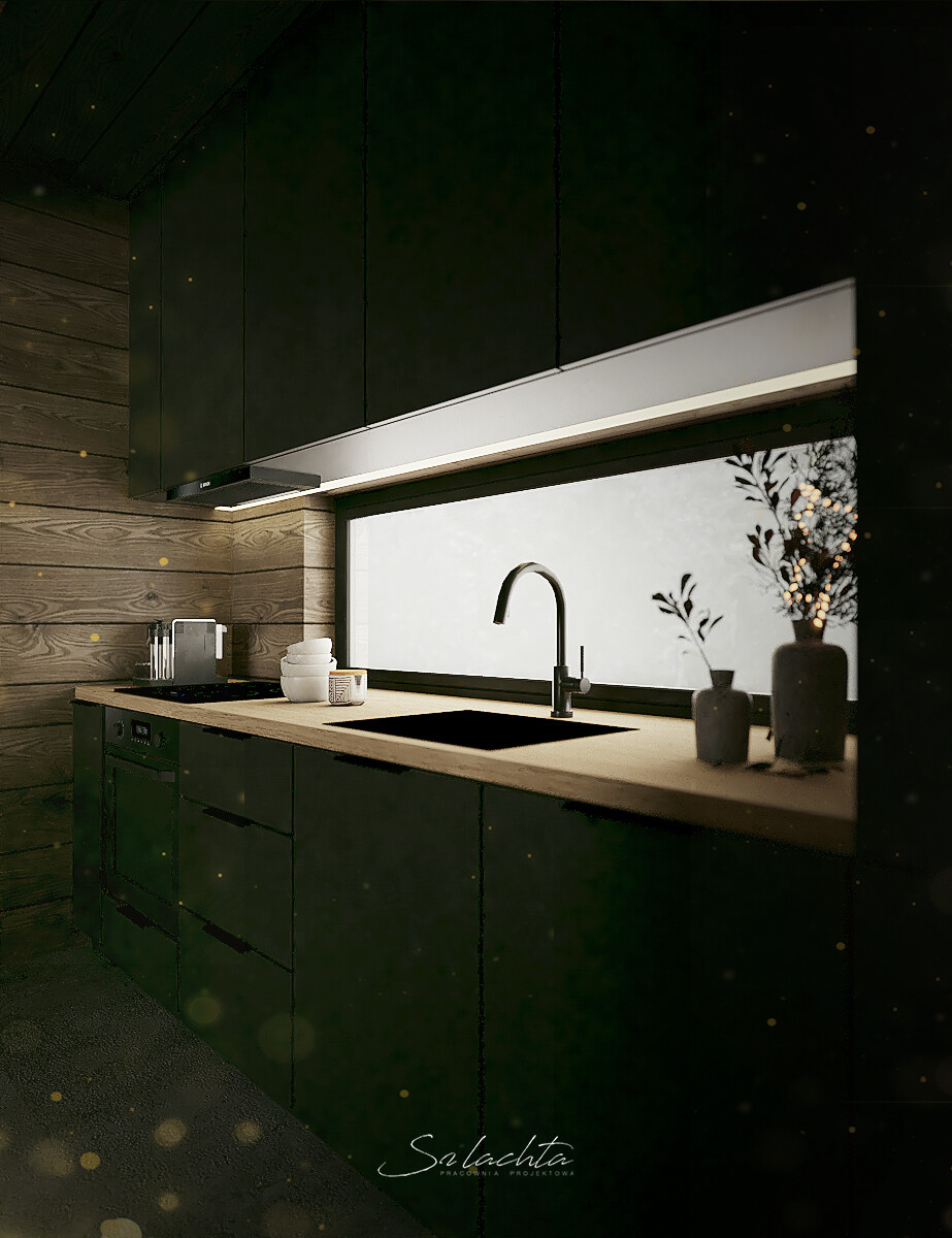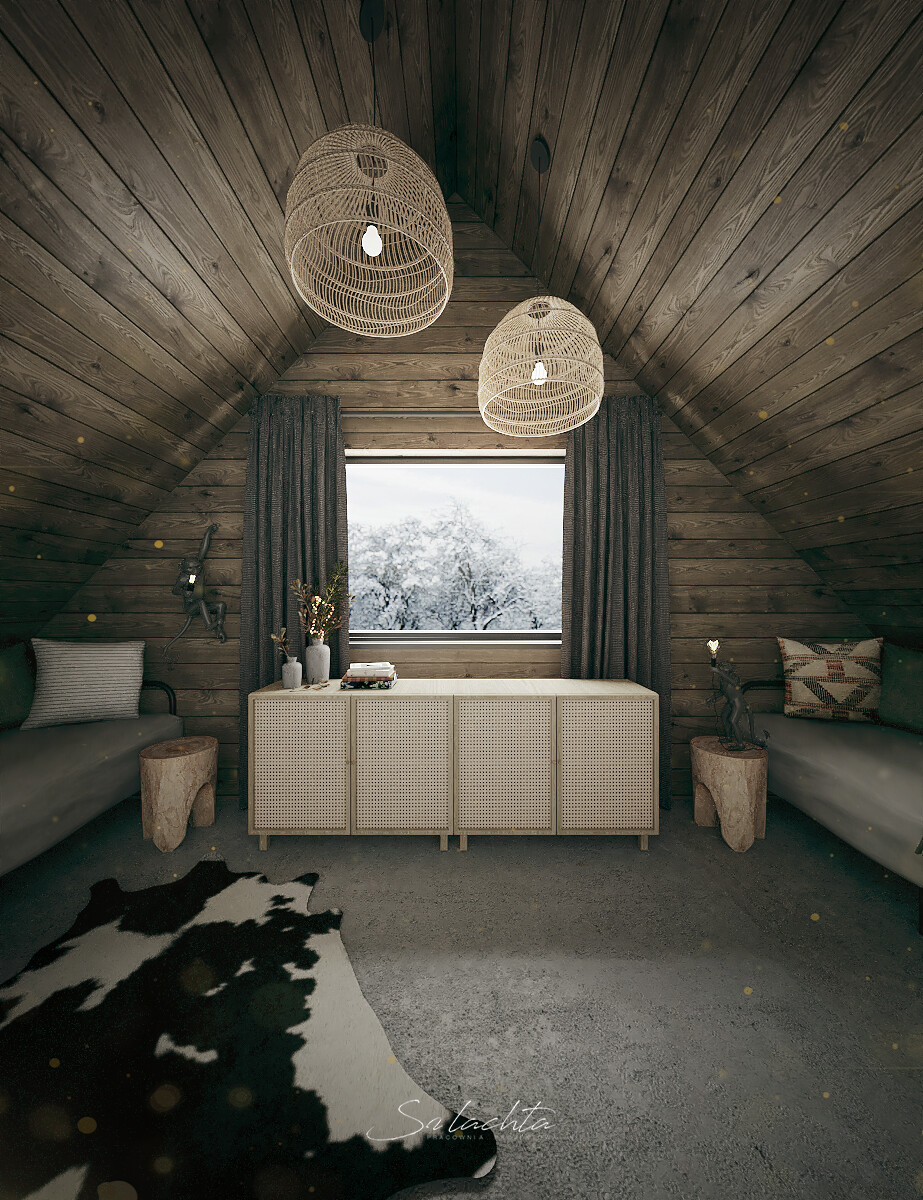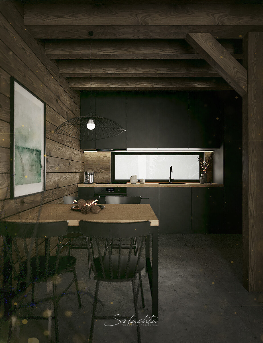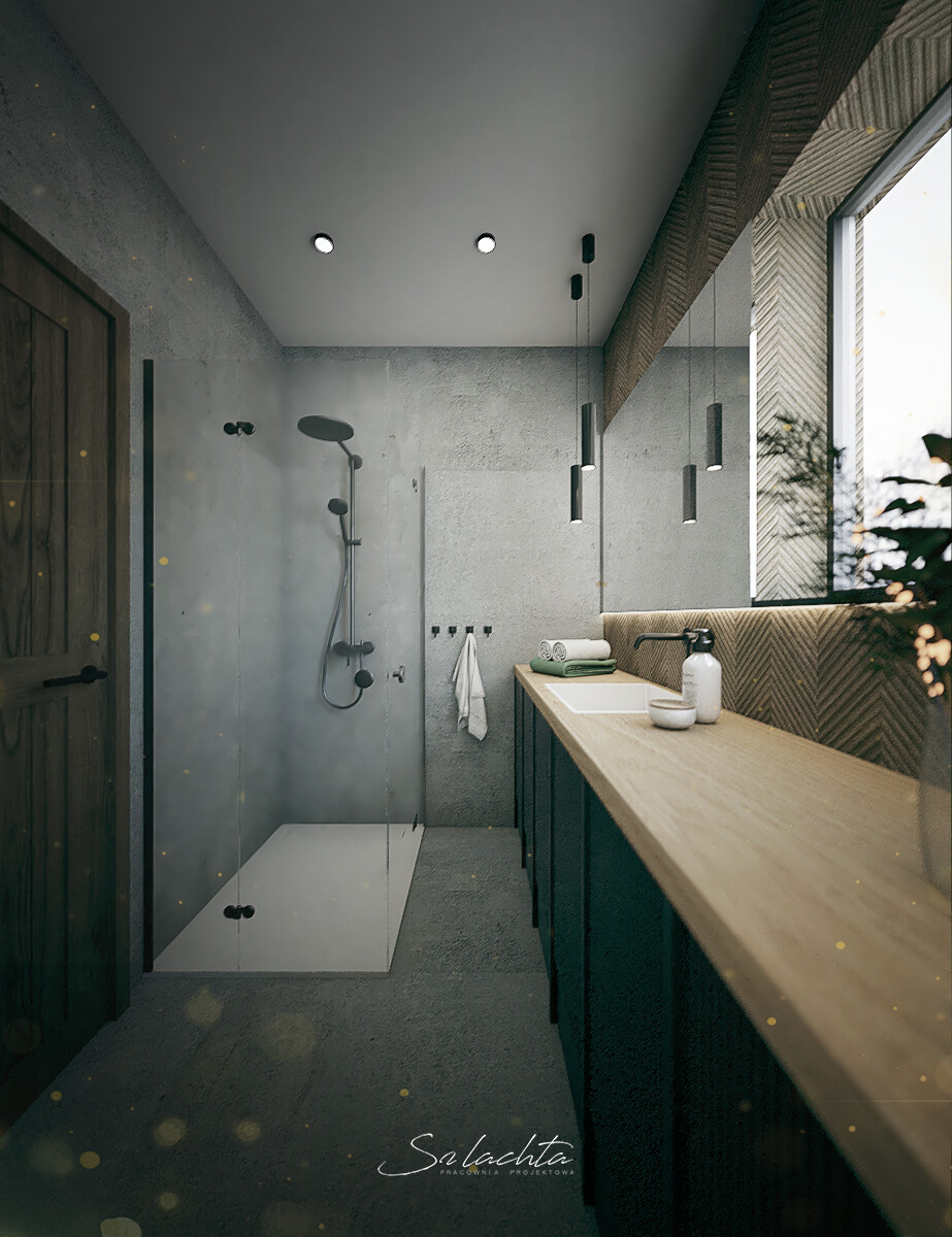 Projekt wnętrza domu przeznaczonego na wynajem krótkoterminowy powstał z myślą o stworzeniu przestrzeni, która od pierwszych chwil pozwala gościom poczuć spokój, ciepło i bliskość natury. Inspiracją stał się krajobraz Kaszub - lasy, jeziora oraz naturalne materiały, które zostały przeniesione do środka w formie drewna o wyraźnej strukturze, stonowanej palety barw i miękkiego, nastrojowego światła. Sercem domu jest przytulna strefa dzienna z wygodną sofą i kominkiem, który wprowadza atmosferę relaksu i sprzyja wspólnemu spędzaniu czasu. Drewniane wykończenia oraz surowe, naturalne faktury zestawiono z nowoczesnymi elementami wyposażenia, dzięki czemu wnętrze łączy w sobie przyjemną, domową aurę z elegancką prostotą. Przestrzeń została zaprojektowana tak, aby była nie tylko piękna, ale też wyjątkowo funkcjonalna i trwała w użytkowaniu komercyjnym. Kuchnia oraz jadalnia kontynuują ten sam klimat – ciemne akcenty zestawione z drewnem i subtelnym światłem tworzą nastrojową, komfortową przestrzeń do wspólnych posiłków. W łazience naturalne motywy dopełnia spokojna geometria i delikatne detale, nadając jej nowoczesny, ale przyjazny charakter. W części nocnej dominują miękkie tkaniny, naturalne odcienie oraz duże przeszklenia otwierające wnętrze na widok przyrody - zmieniającej się wraz z porami roku. Kameralne kąciki do czytania i strefy odpoczynku budują poczucie prywatności i intymności, pozwalając naprawdę zwolnić tempo. To wnętrze stworzone po to, by goście mogli odpocząć, a właściciel miał pewność, że przestrzeń sprawdzi się w intensywnym, komercyjnym użytkowaniu. Przytulne, naturalne i pełne kaszubskiego ducha – idealne do wypoczynku przez cały rok.