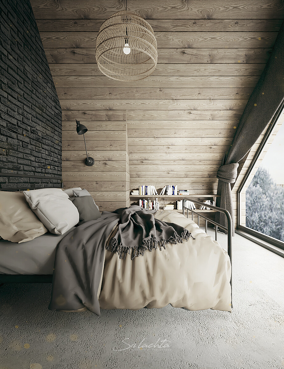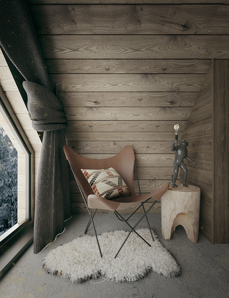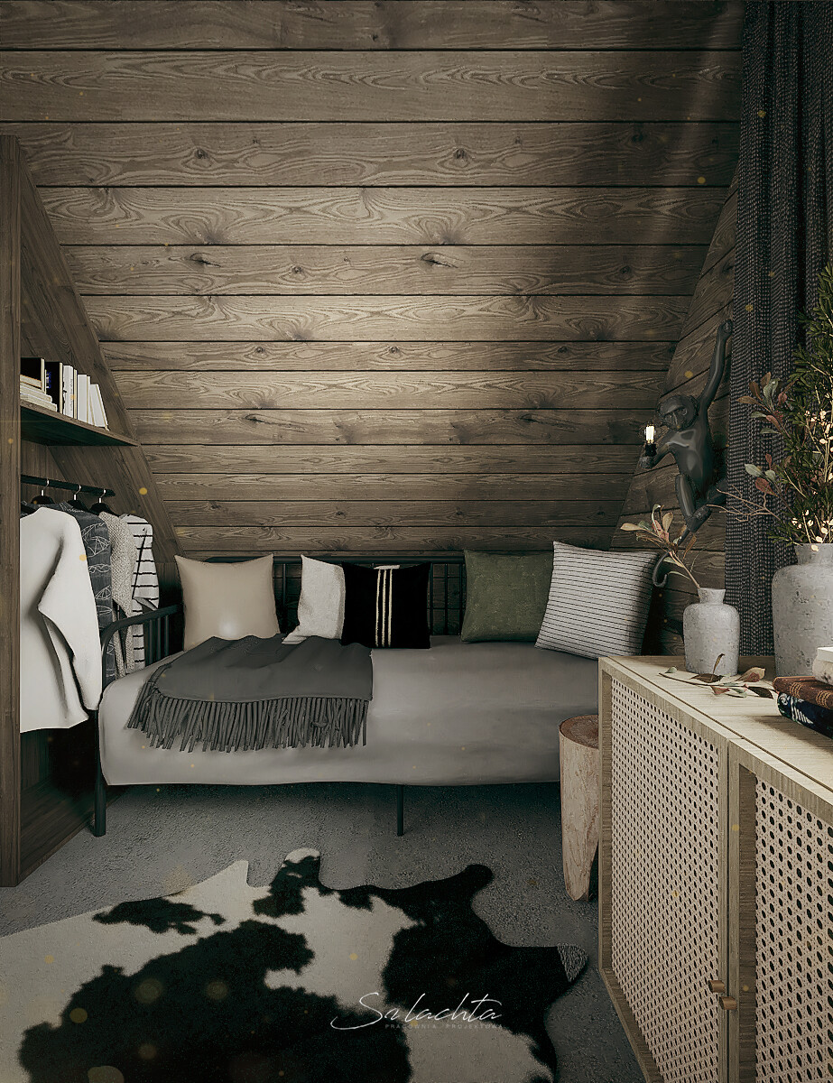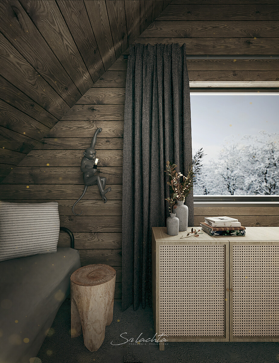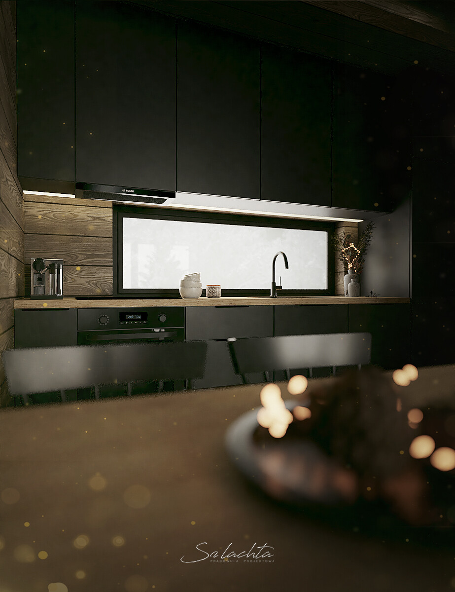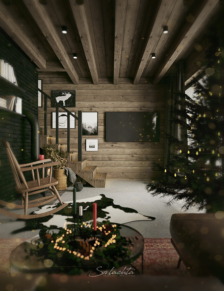 Projekt wnętrza domu przeznaczonego na wynajem krótkoterminowy powstał z myślą o stworzeniu przestrzeni, która od pierwszych chwil pozwala gościom poczuć spokój, ciepło i bliskość natury. Inspiracją stał się krajobraz Kaszub - lasy, jeziora oraz naturalne materiały, które zostały przeniesione do środka w formie drewna o wyraźnej strukturze, stonowanej palety barw i miękkiego, nastrojowego światła. Sercem domu jest przytulna strefa dzienna z wygodną sofą i kominkiem, który wprowadza atmosferę relaksu i sprzyja wspólnemu spędzaniu czasu. Drewniane wykończenia oraz surowe, naturalne faktury zestawiono z nowoczesnymi elementami wyposażenia, dzięki czemu wnętrze łączy w sobie przyjemną, domową aurę z elegancką prostotą. Przestrzeń została zaprojektowana tak, aby była nie tylko piękna, ale też wyjątkowo funkcjonalna i trwała w użytkowaniu komercyjnym. Kuchnia oraz jadalnia kontynuują ten sam klimat – ciemne akcenty zestawione z drewnem i subtelnym światłem tworzą nastrojową, komfortową przestrzeń do wspólnych posiłków. W łazience naturalne motywy dopełnia spokojna geometria i delikatne detale, nadając jej nowoczesny, ale przyjazny charakter. W części nocnej dominują miękkie tkaniny, naturalne odcienie oraz duże przeszklenia otwierające wnętrze na widok przyrody - zmieniającej się wraz z porami roku. Kameralne kąciki do czytania i strefy odpoczynku budują poczucie prywatności i intymności, pozwalając naprawdę zwolnić tempo. To wnętrze stworzone po to, by goście mogli odpocząć, a właściciel miał pewność, że przestrzeń sprawdzi się w intensywnym, komercyjnym użytkowaniu. Przytulne, naturalne i pełne kaszubskiego ducha – idealne do wypoczynku przez cały rok.