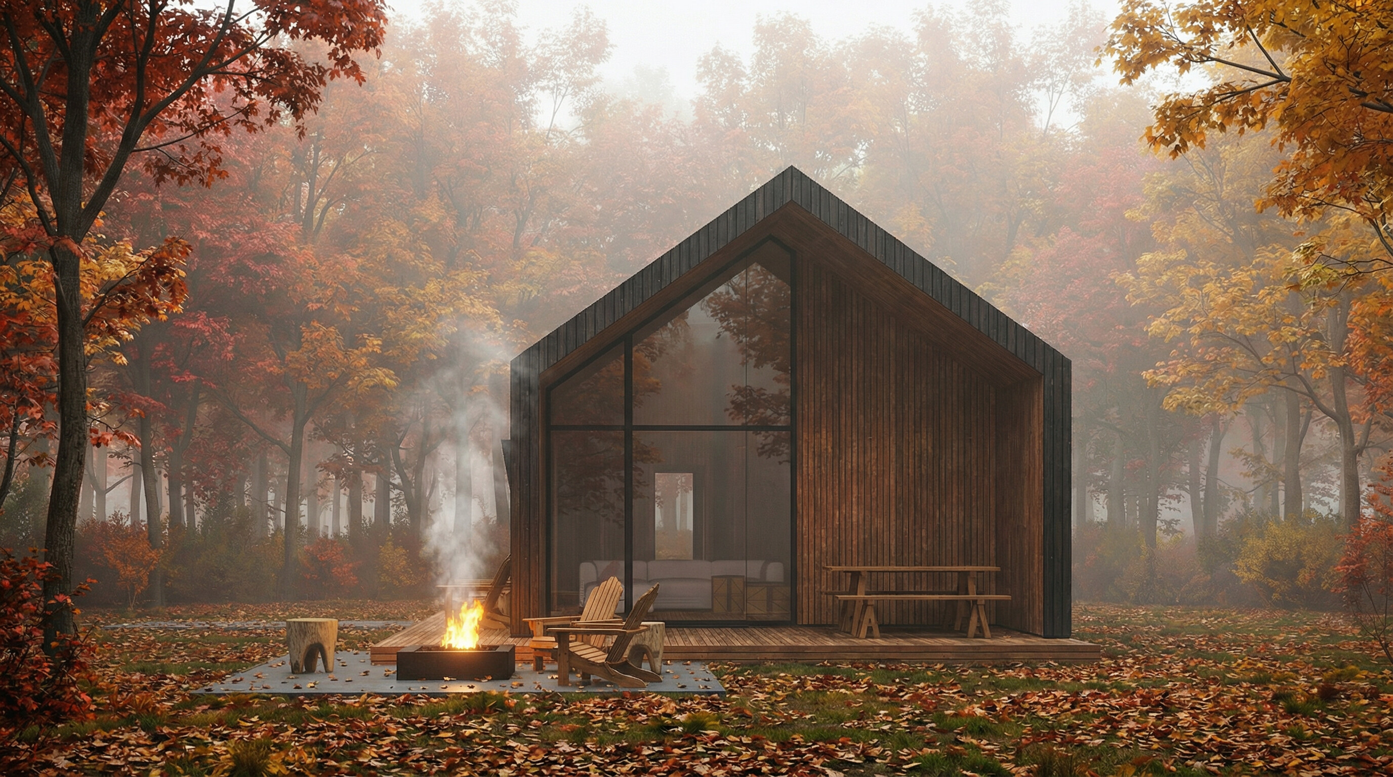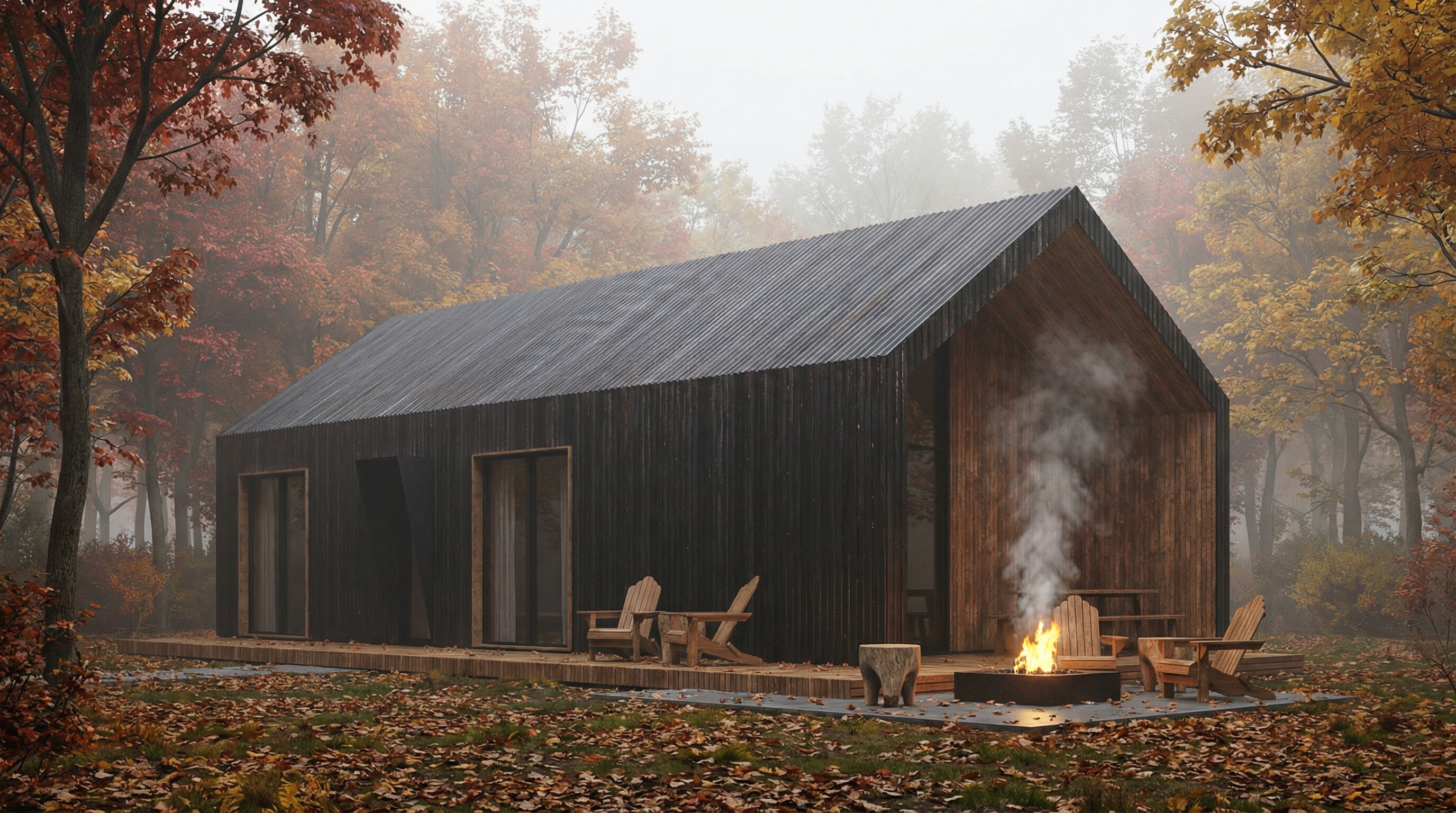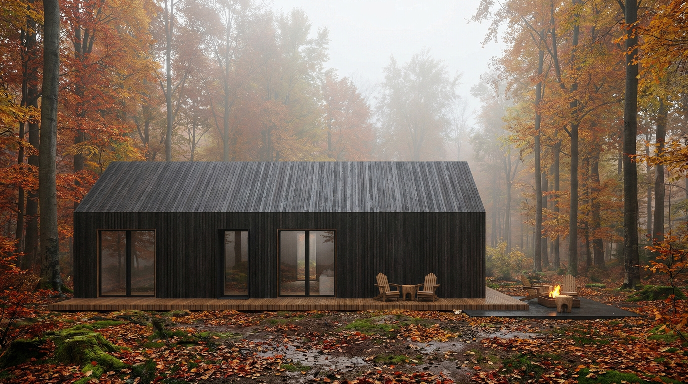 Ten projekt to odpowiedź na potrzebę bliskości natury i świadomego, prostego życia. Dom szkieletowy o powierzchni ok. 60 m² został zaprojektowany na działce położonej pod lasem w Rekowie na Kaszubach - w miejscu, gdzie codzienność zwalnia, a przestrzeń naturalnie porządkuje myśli. Prosta, czytelna bryła przykryta dwuspadowym dachem nawiązuje do tradycyjnych, kaszubskich form, ale została odczytana w nowoczesny sposób. Ciemne wykończenie elewacji wpisuje dom w leśny krajobraz, pozwala mu „zniknąć” wśród drzew i stać się częścią otoczenia, a nie jego dominującym elementem. Duże przeszklenia otwierają wnętrze na widoki i światło, dzięki czemu natura staje się integralną częścią codziennego funkcjonowania. Dom zaprojektowano jako przestrzeń do odpoczynku, pracy zdalnej lub całorocznego zamieszkania – kompaktową, ale przemyślaną i komfortową. Taras, strefa ogniska i naturalnie ukształtowana przestrzeń wokół budynku tworzą miejsce do spotkań, wyciszenia i bycia blisko tego, co najważniejsze.