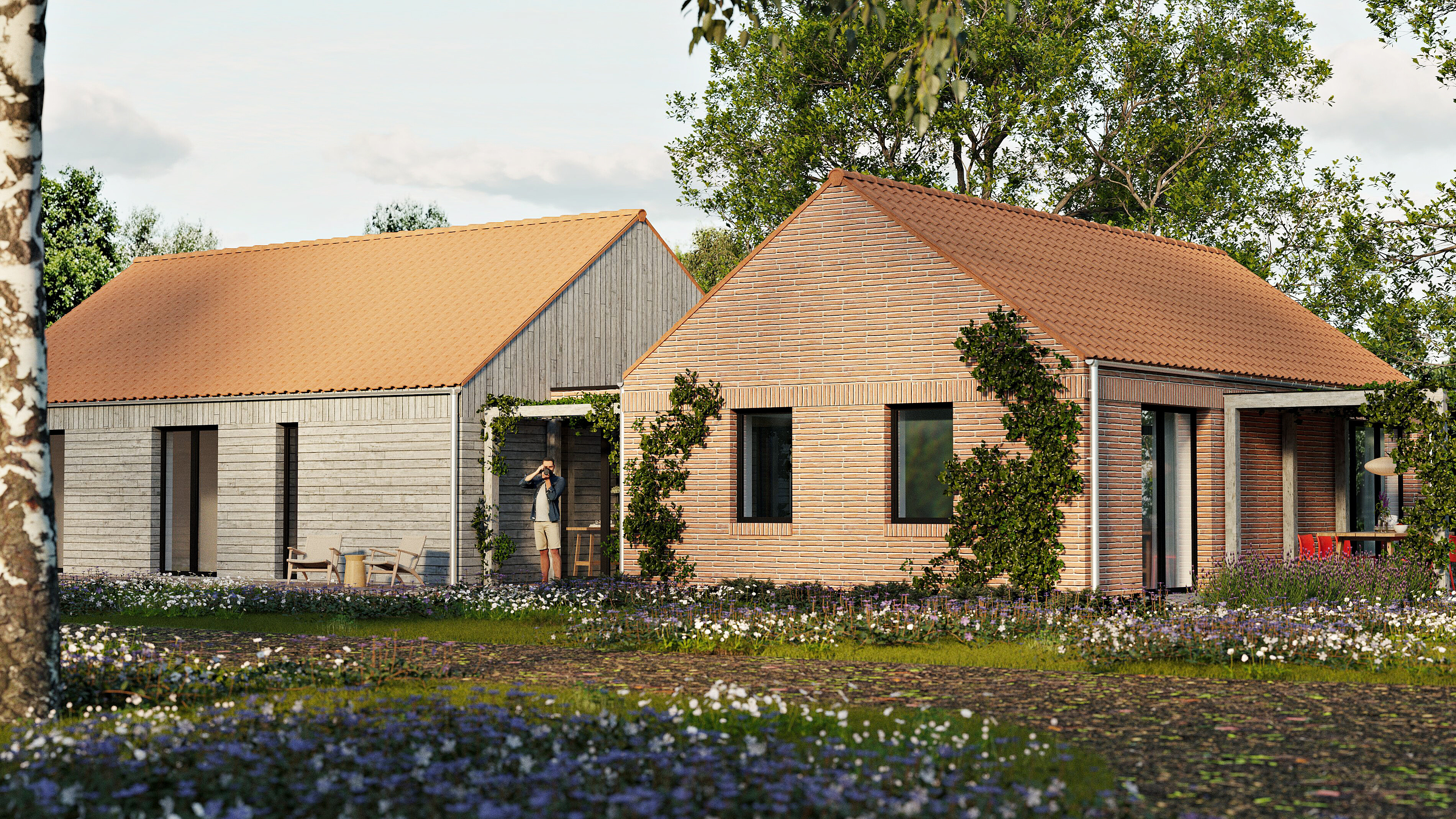 Funkcjonalność i wygoda: Dom składa się z dwóch brył połączonych przeszklonym łącznikiem, co zapewnia funkcjonalny podział przestrzeni na strefę dzienną i nocną.