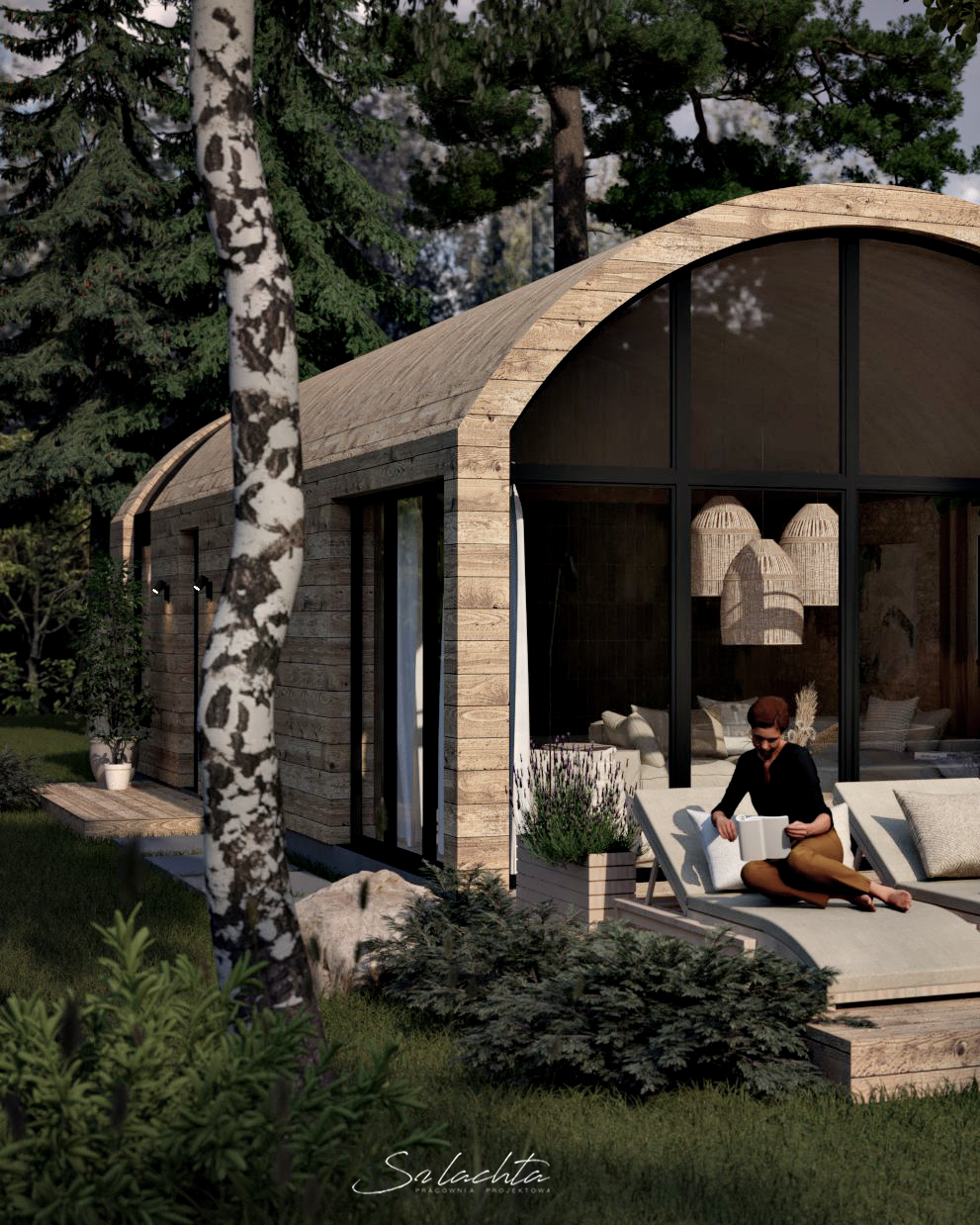 Uline Cottages are characterized by a simple and legible shape, while the subtle arched roof gives them a unique character. The wooden finish of the facade emphasizes the natural character of the surroundings. The interiors of the cottages are bright and spacious, and large windows provide access to natural light. Finished in light and natural colors with plenty of wood and stone, they create a cozy and friendly atmosphere.